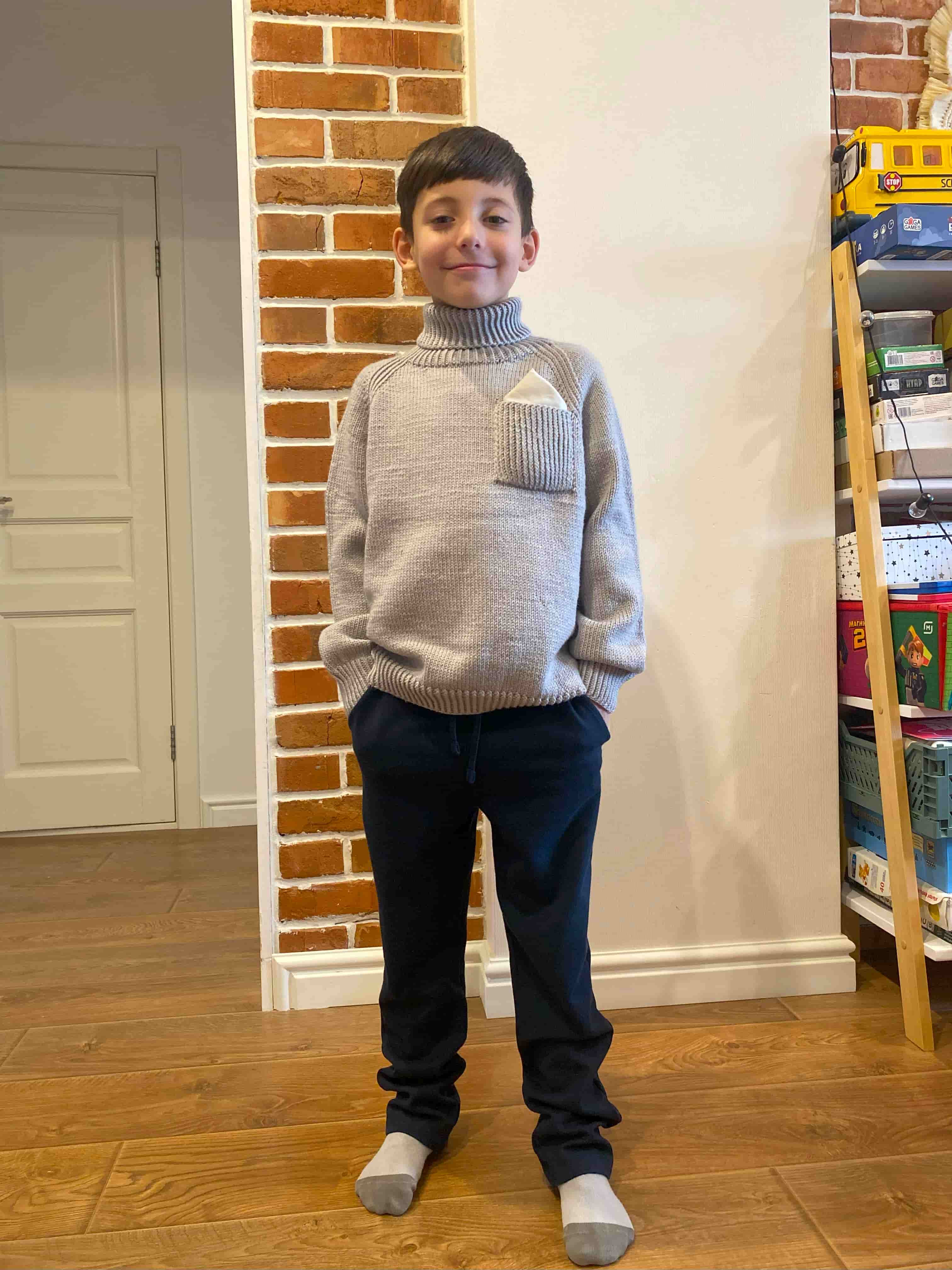 Расход пряжи на основное полотно: Размер 98/104см – 6 мотков Размер 104/110см – 7 мотков Размер 110/116см – 8-9 мотков Размер 116/122см - 9-10 мотков Размер 122/128см – 10 мотков Размер 128/134см - 11 мотков